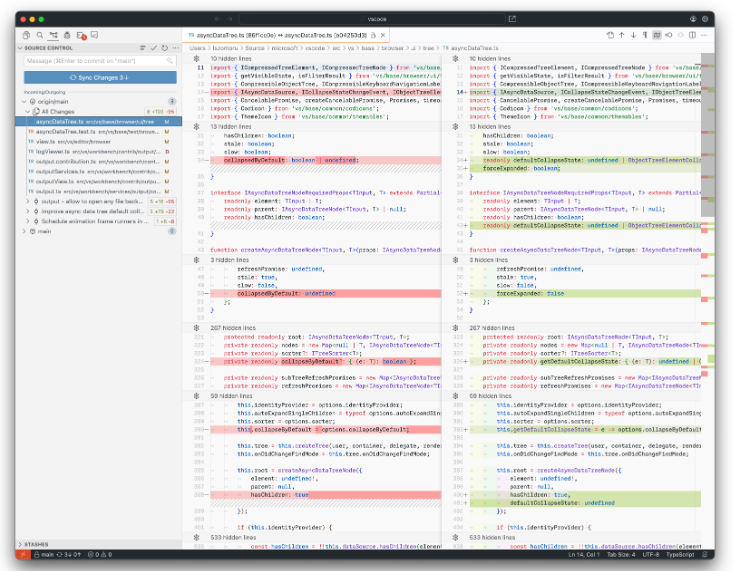 源代码控制视图中新增了展示当前分支与远程分支之间的来往更改的“收发变更”部分,用户可以控制这一部分的可见性。